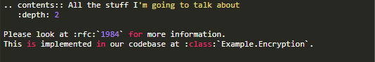 可以了解更多关于 rfc, class和 contents的概念。 作为一个使用rST或Asciidoctor的开发者,我可以以一种简单,可插入的方式增添新的标记。 我不必改变语言的解析方式,而且我还可以通过标准扩展机制向其它用户分享那些新功能。 在不同的版本间进行移植这些功能,用Markdown可办不到。 注意:CommonMark正在开发可扩展性的语法,但还没有实现。